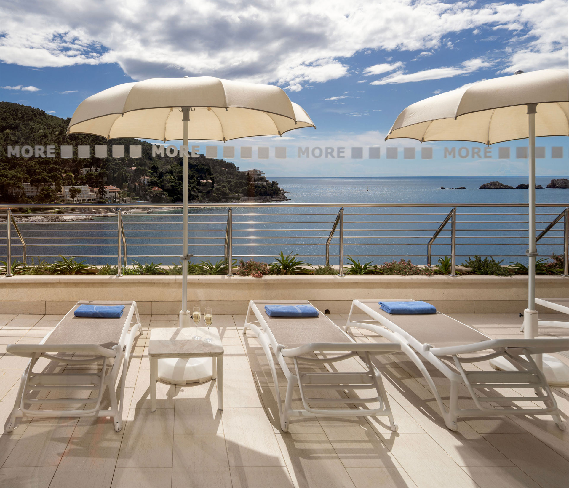 Auf mehreren Terrassenebenen erstreckt sich der Sonnenterrassenbereich des Hotel More und umfasst zwei Außenpools, einen Innen-Whirlpool sowie eine Terrasse mit Meerblick mit Liegen und Sonnenschirmen – ideal für erfrischende Bäder im türkisfarbenen Wasser der Adria.
