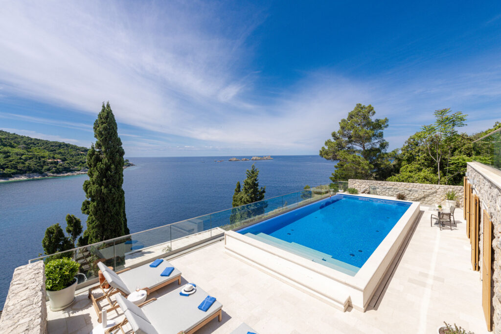 The villa boasts elegantly appointed apartments, a sauna and an infinity pool. Guests are invited to unwind in style and savour the enchanting sunsets over the Adriatic.