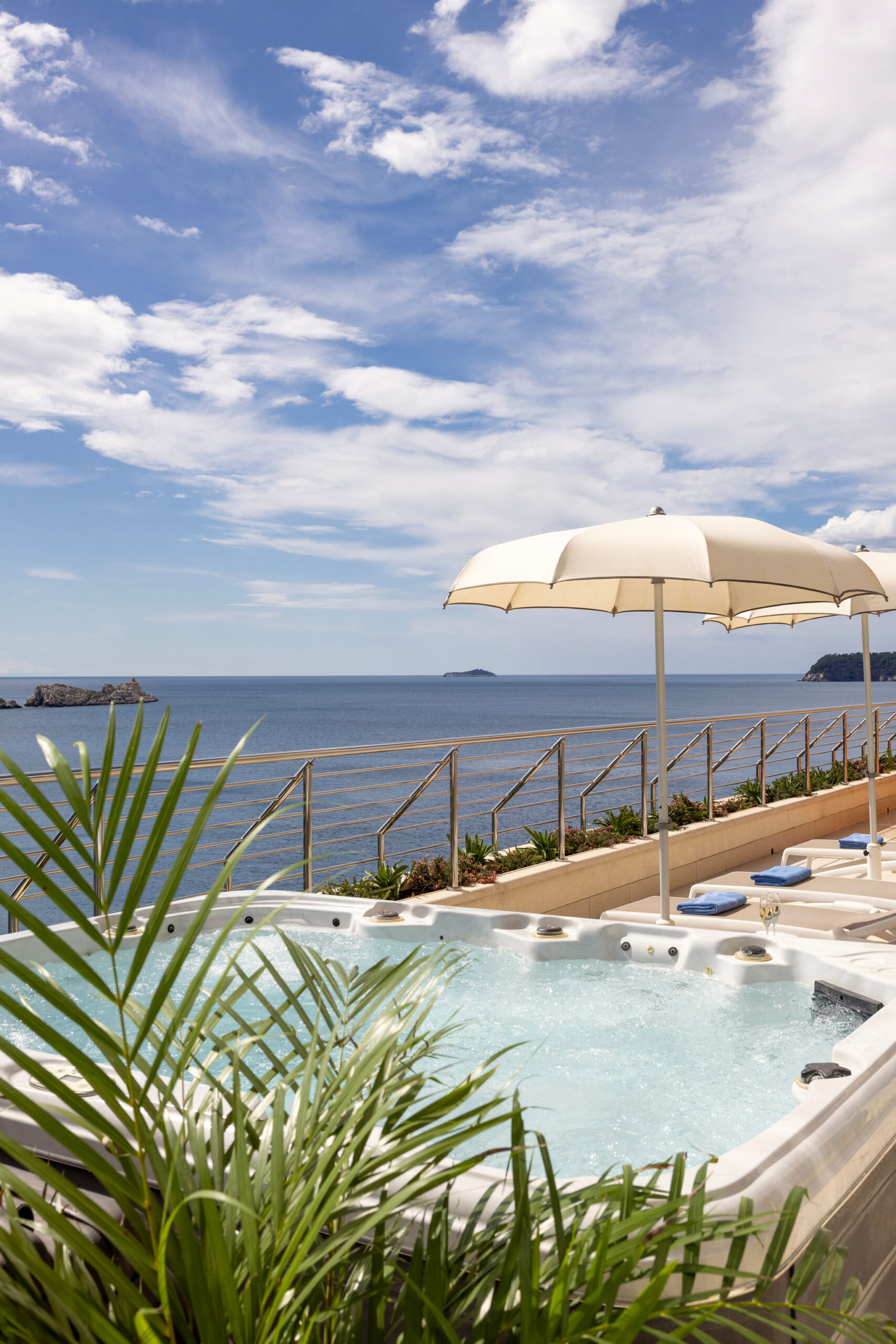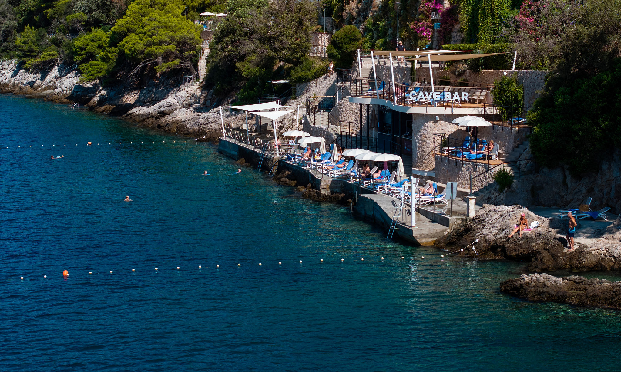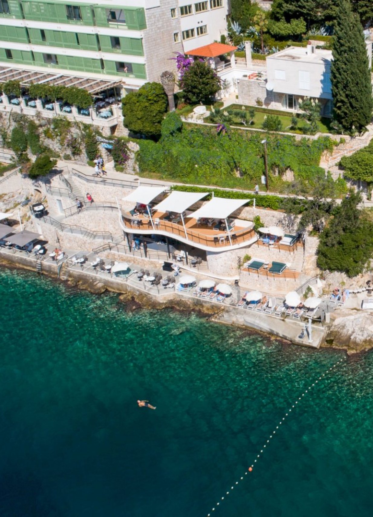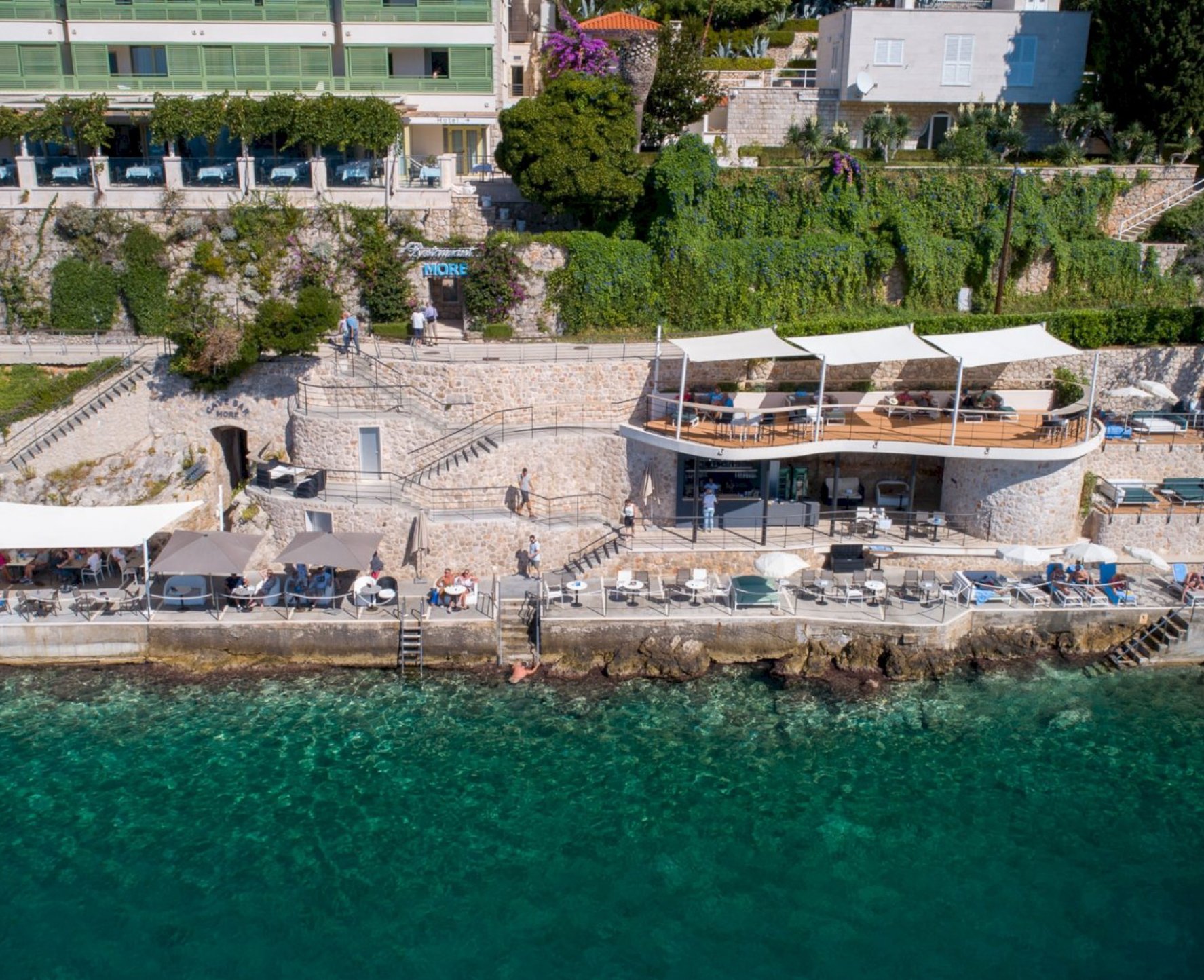 Hotel More’s sunbathing area lies just below the hotel – an ideal spot to soak up the sun and sea, with views of century-old pines, crystal-clear waters, dramatic Grebeni cliffs, and the Elaphiti Islands.